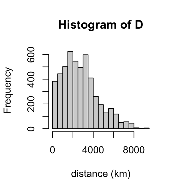 hist(D,breaks = 16,xlab = "distance (km)")
